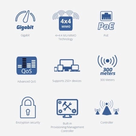 کارکرد در دو فرکانس ۲.۴ و ۵ GHz | دارای ۴ آنتن قابل تعویض Omnidirectional | امکان استفاده در محیط داخلی و بیرون Indoor and Outdoor (مقاوم در برابر آب و رطوبت) | آنتن دهی بسیار قدرتمند تا شعاع ۳۰۰ متر (آنتن با گین ۳.۵dBiدر دو فرکانس ۲.۴ و ۵ گیگاهرتز) | امکان اتصال و سرویس دهی همزمان به ۲۰۰ کاربر