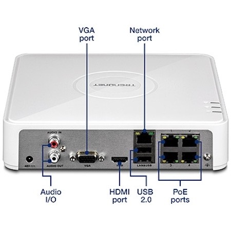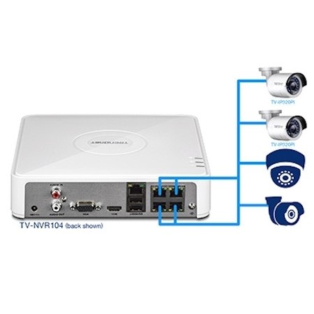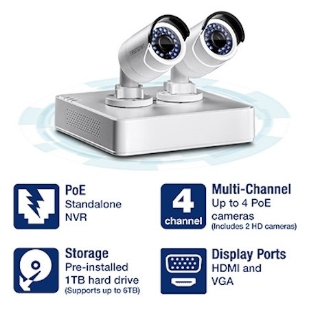 شامل یک عدد NVR با ۴ کانال POE با هارد ۱ ترابایت SATA و دو عدد دوربین TRENDnet TV-IP320PI ضبط ویدئو تا Full HD 720p پشتیبانی می شودبیش از 6.5 روز ضبط مستمر **پشتیبانی از ONVIF